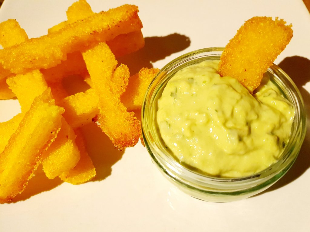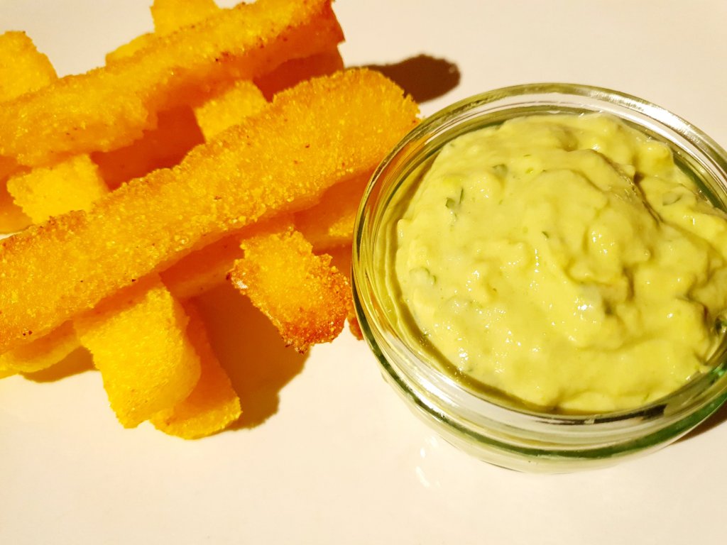 The original recipe says to fry the polenta, but I decided to bake it instead. For the dipping sauce I used what I had available at home, avocado, plant base yogurt, parsley and lemon.