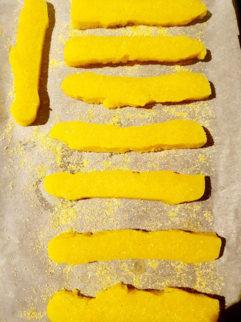 Place the polenta slices on the tray and sprinkle the other Tbsp of semolina all over the polenta.