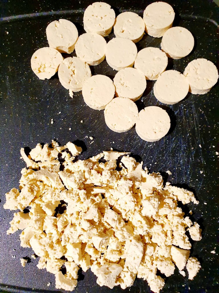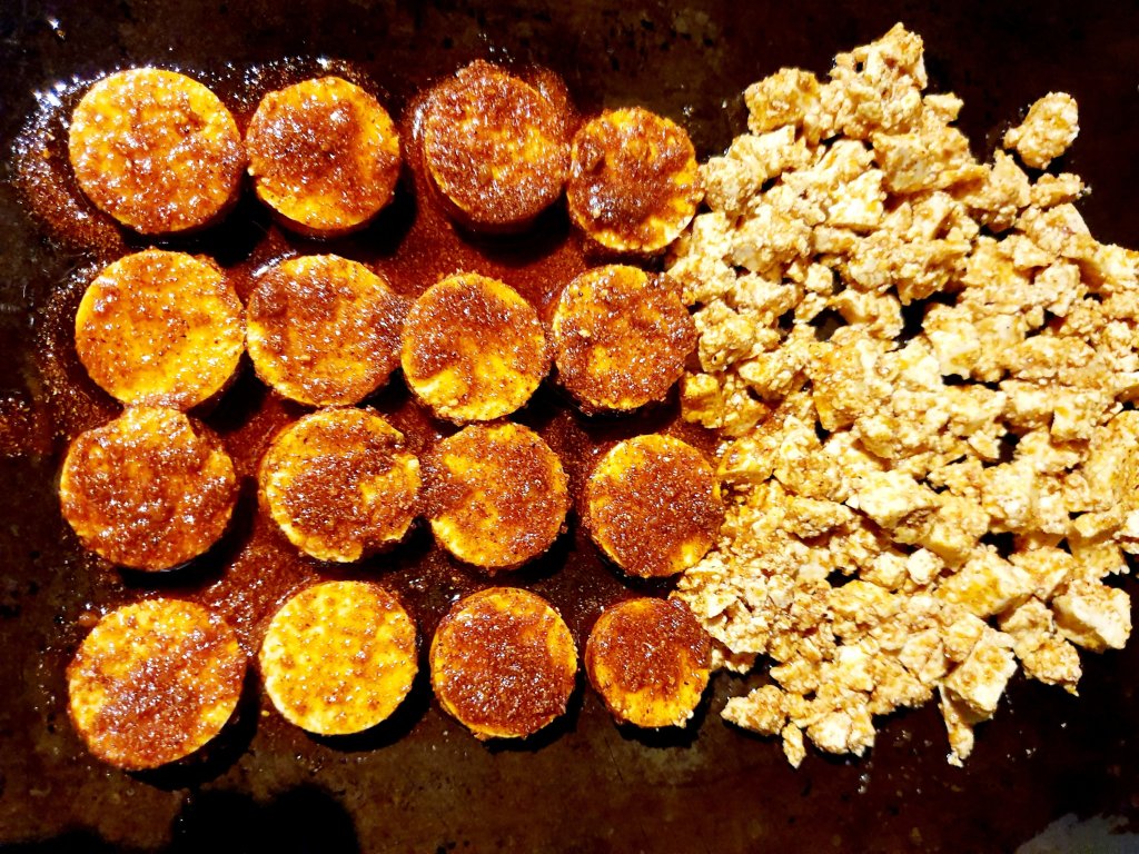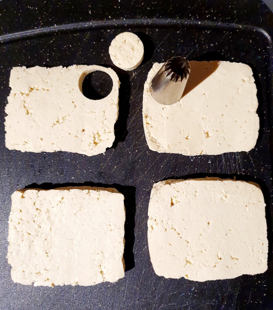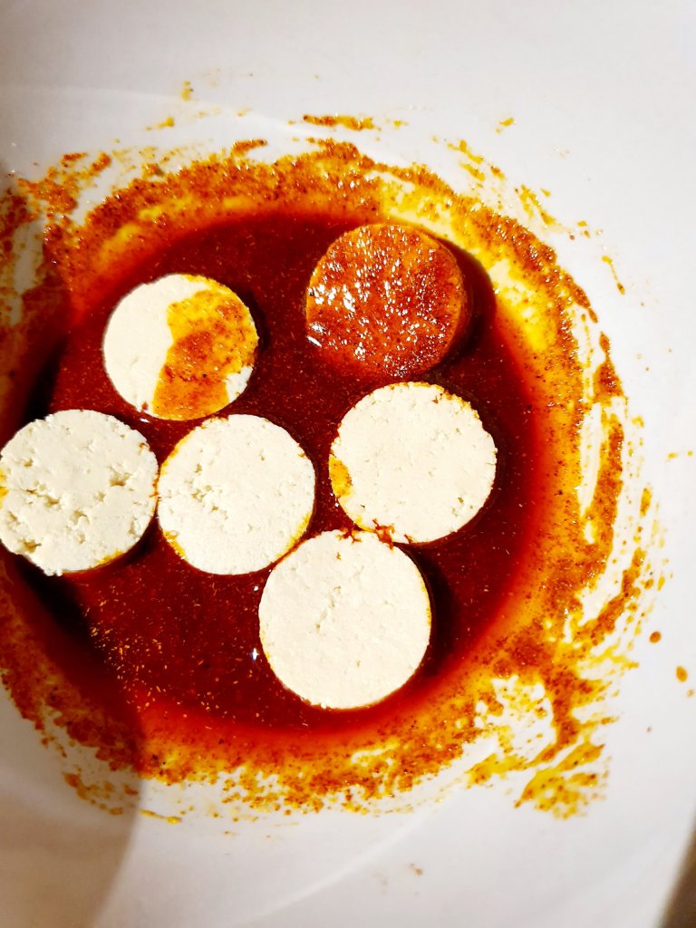 Cut the tofu in half a centimetre thick slices, then using a piping nozzle (it was what I had available), cut the circles to make the chorizo slices. Crumble the left overs to make crispy tofu chorizo crumbs.