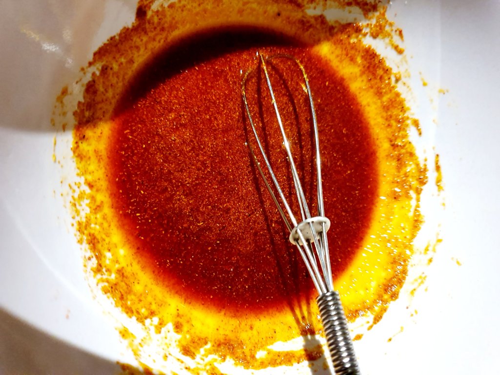 Add all the spices and the oil for the tofu chorizo mixture in a bowl, mix together and set aside.