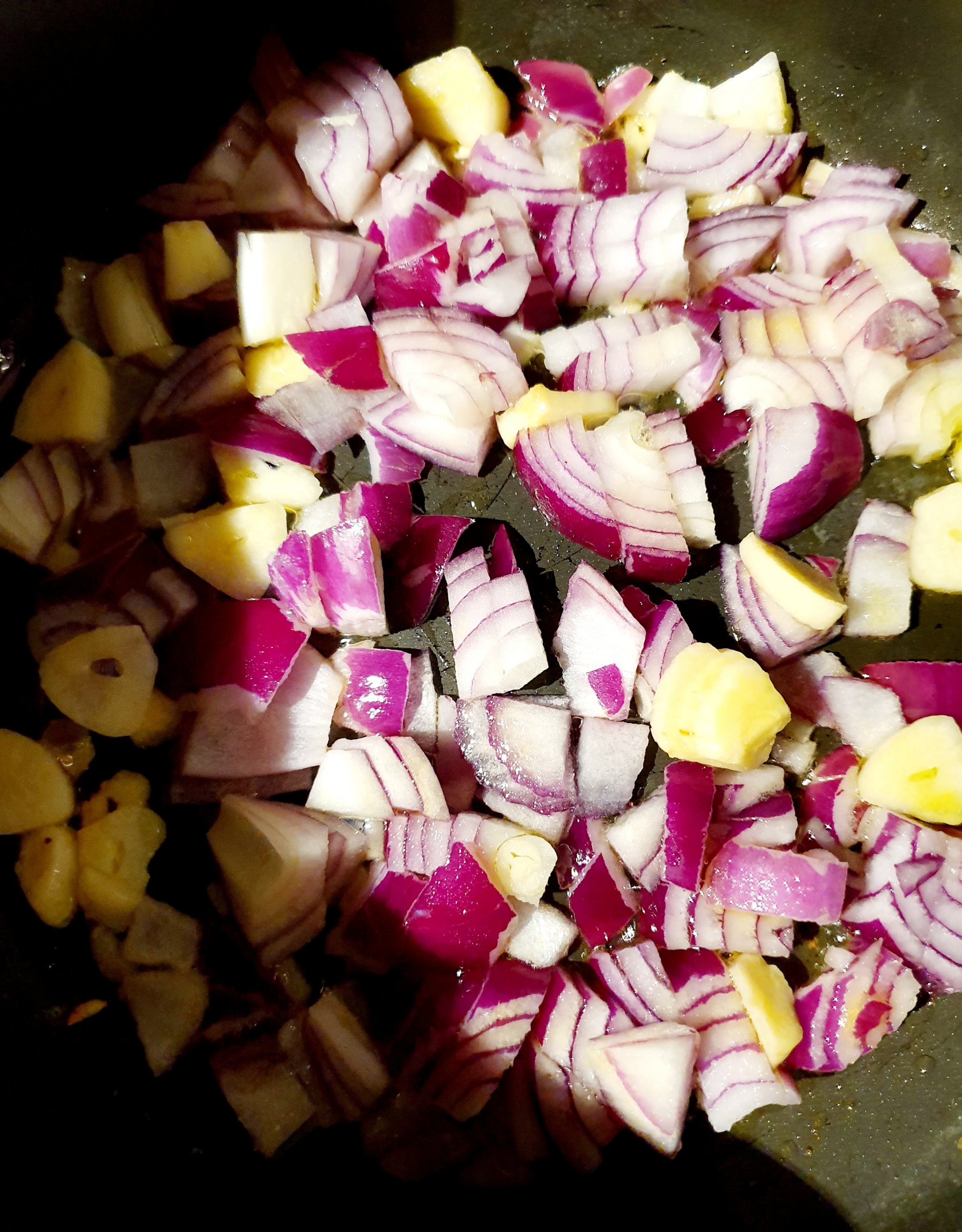 2 onions (the original recipe mention white onion, I used what I had at home, red onion)