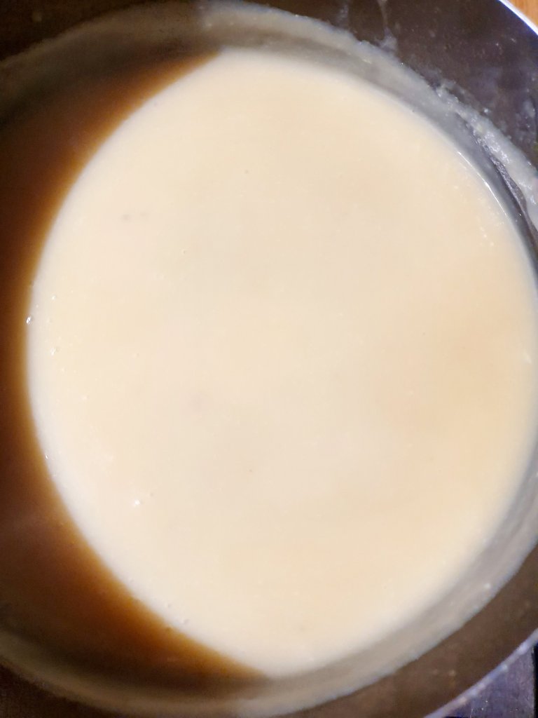 Using a hand mixer, blend it all together to a creamy consistency and let it simmer so you can prepare the spring greens.