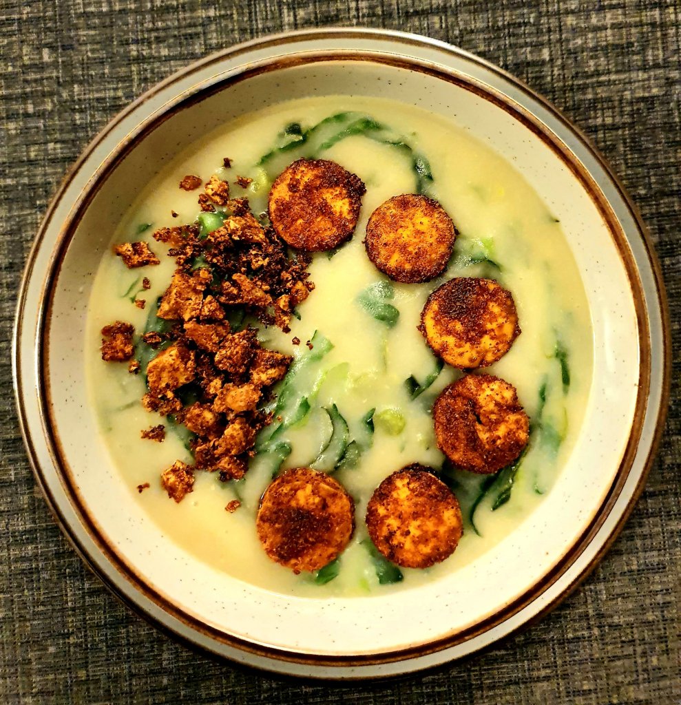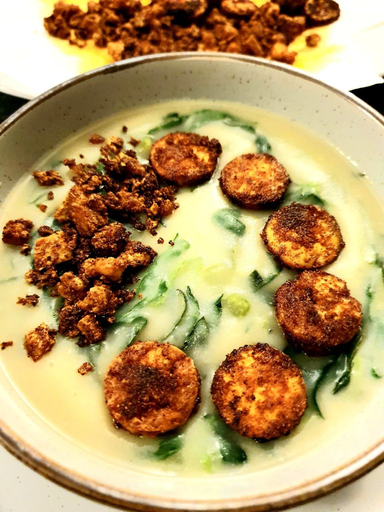Inspired by a traditional Portuguese soup called “Caldo Verde”, also very popular in Brazil. The original recipe includes chorizo sausage, but I didn’t have it at home, so decided to experiment something with tofu.