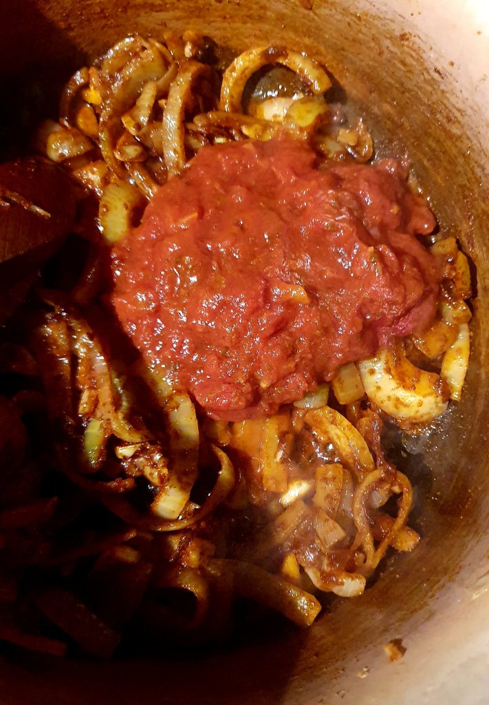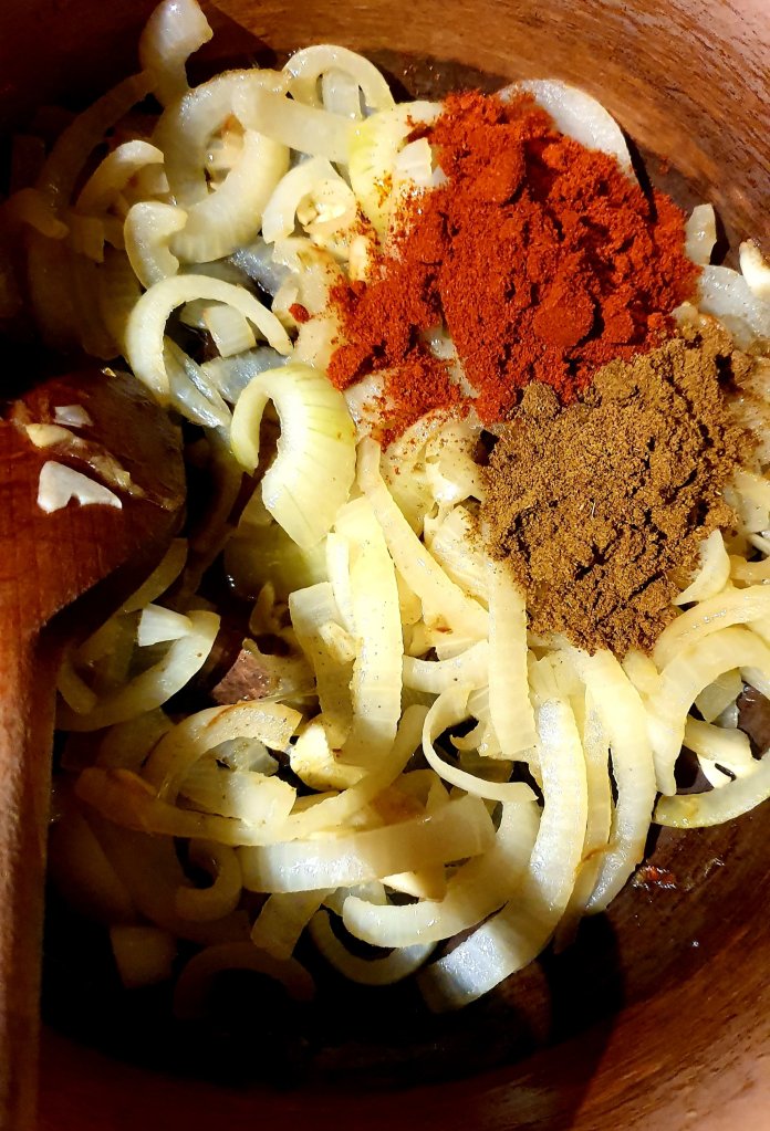 Sautée onions and garlic then add smoked paprika and cumin powder.