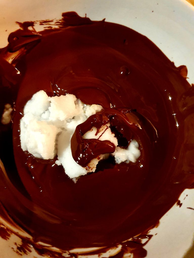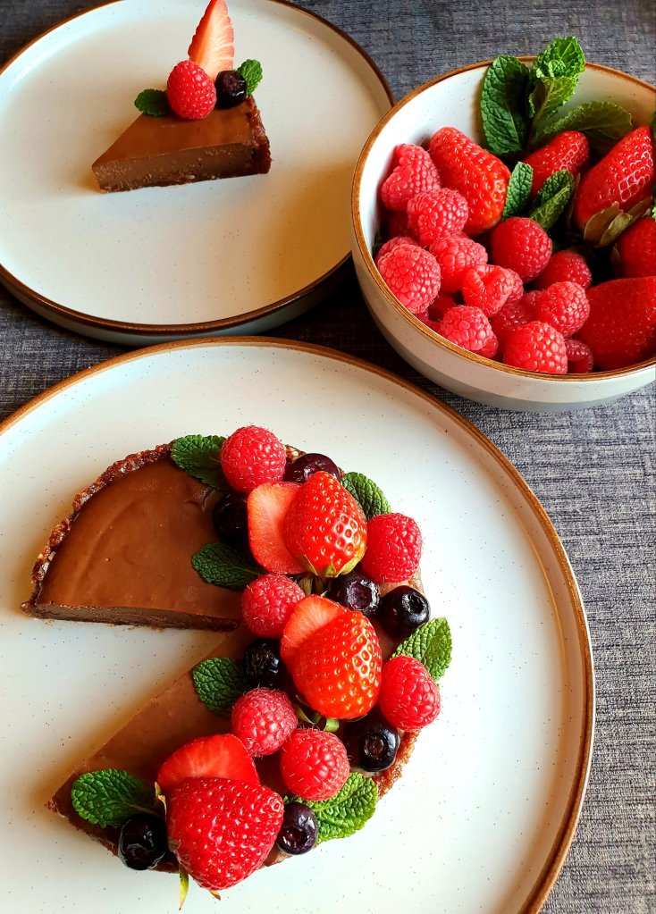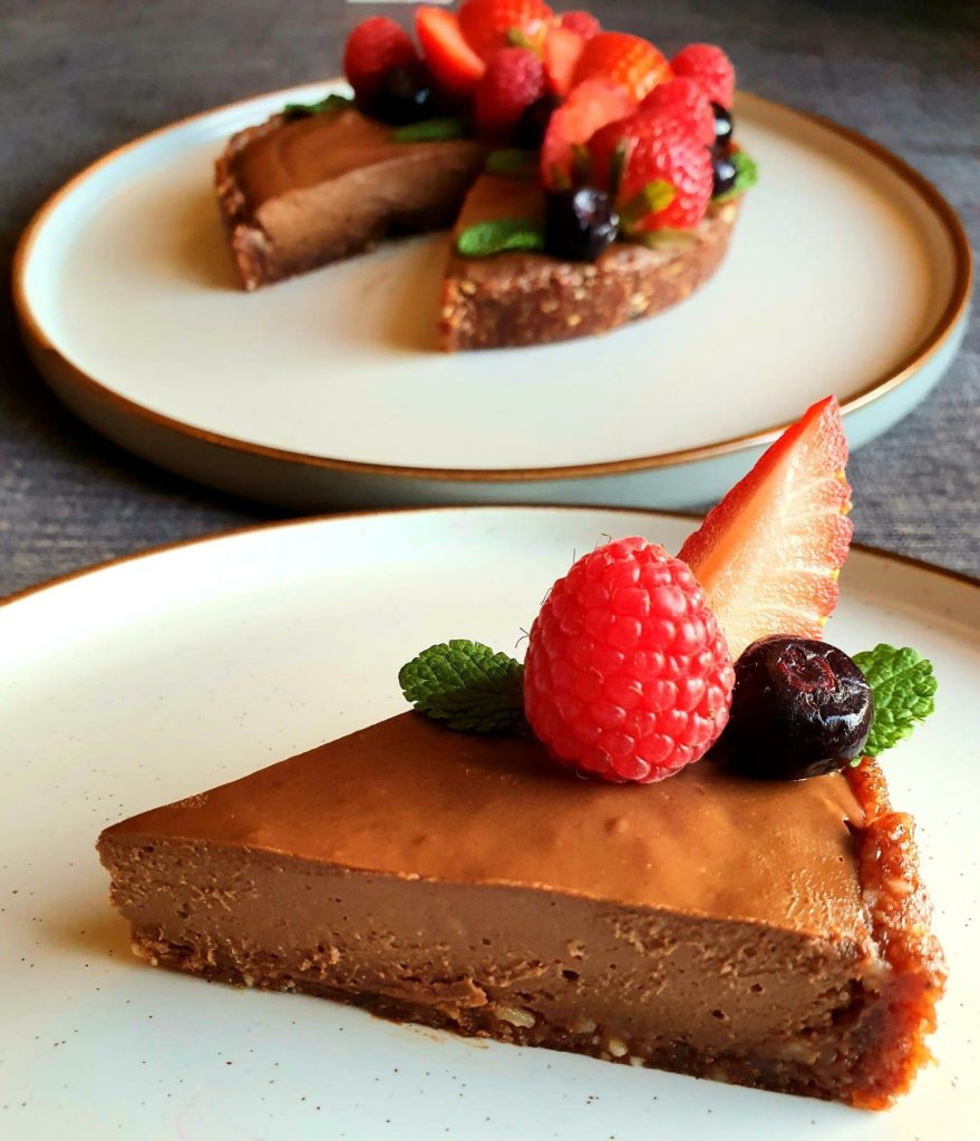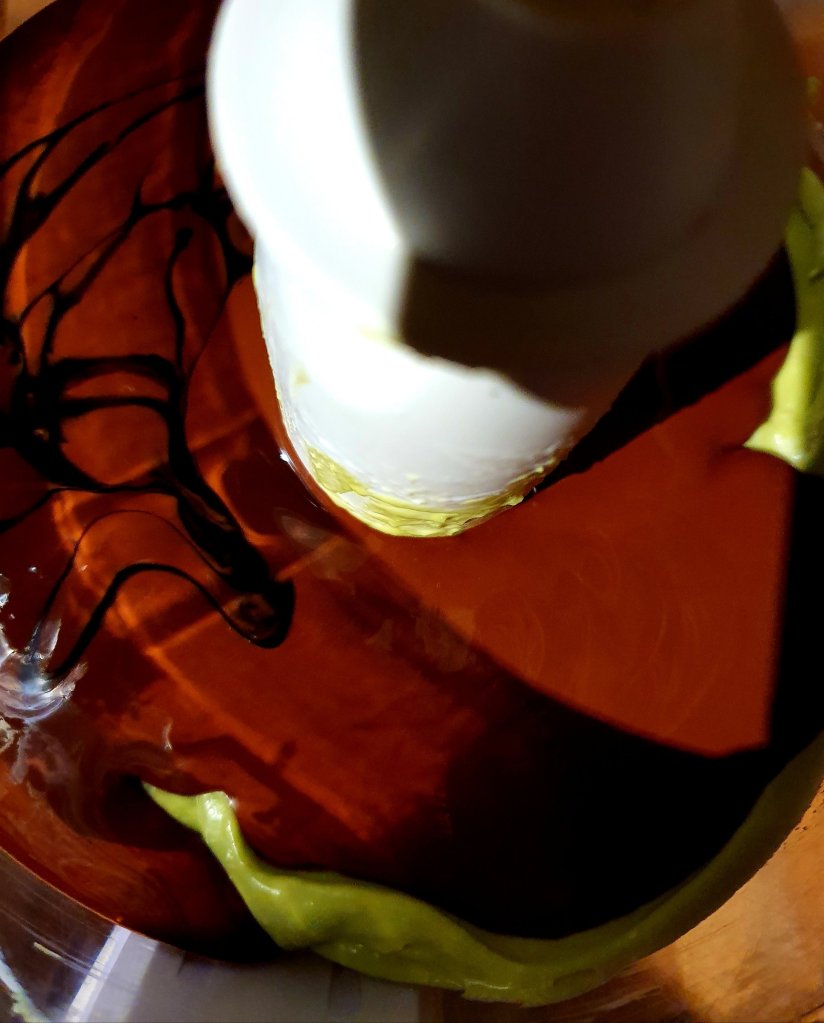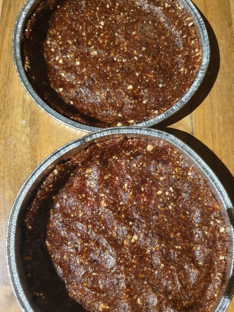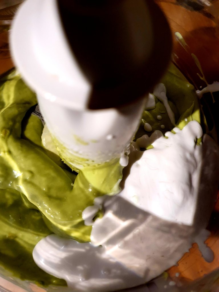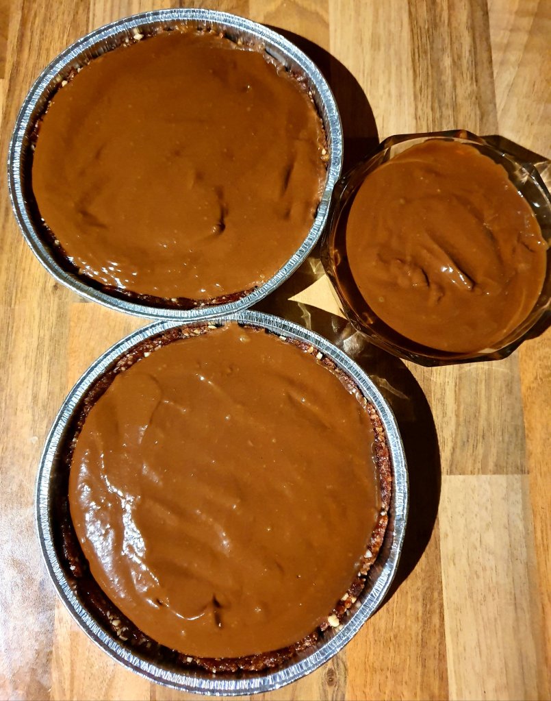 Add the melted chocolate to the avocado mixture with the gelatine (dissolved in 50ml of water, like the sachet instructions) and the dates syrup. Mix it well and it’s ready to assembly the pies.