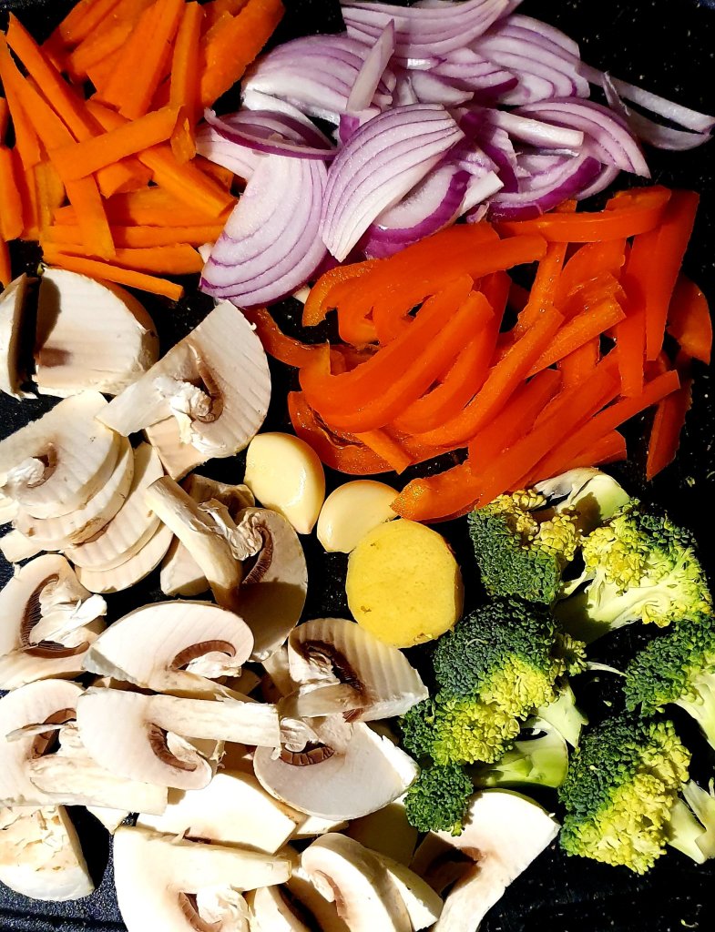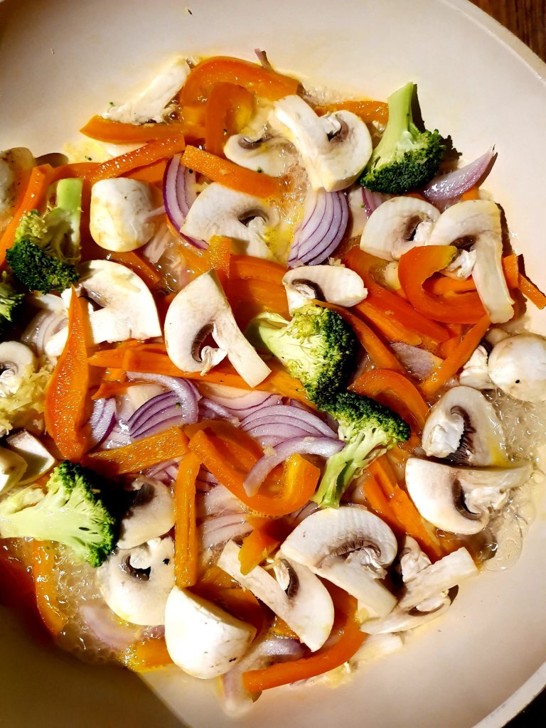 Add all the ingredients (a part from the sesame seeds), and cook it until the broccoli and carrots are tender (you may need to add some extra water if the water evaporates and the vegetables aren’t cooked)