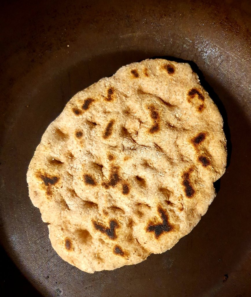 Heat up a non stick frying pan, then add the dough and cook it on side for 3 minutes or until you have those black marks and it’s ready to flip the bread and cook the other side. Continue this process until you cook all 6 flat breads.
