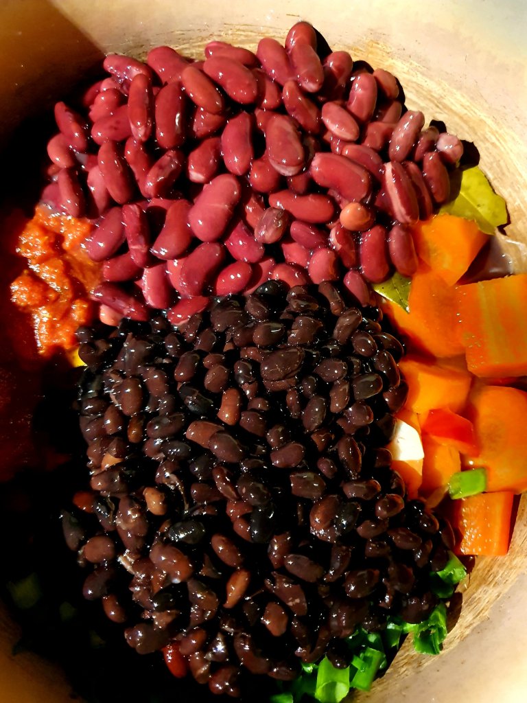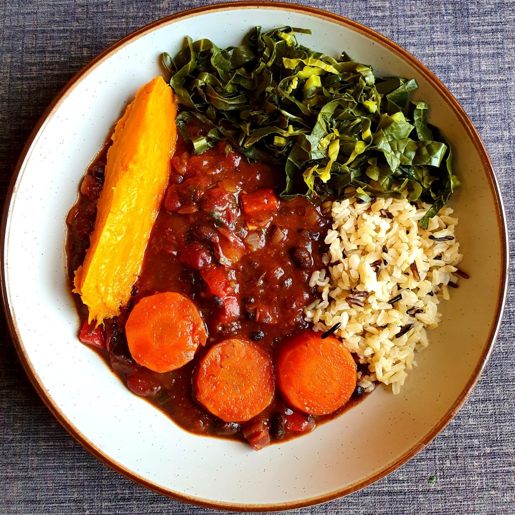 This version took 45 minutes and it tastes divine. If you like beans, I recommend you to try this recipe. Oil and salt free, high in protein!!! I’m serving it with steamed spring greens, roasted sweet potato, and a mixture of organic brown and organic black wild rice! 😊🥰💙🍀