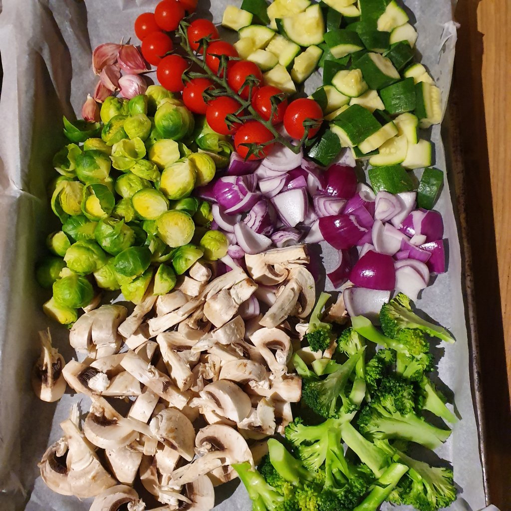 Chopped and place all the vegetables on a baking tray with parchment paper (using parchment paper, as I’m not using oil)