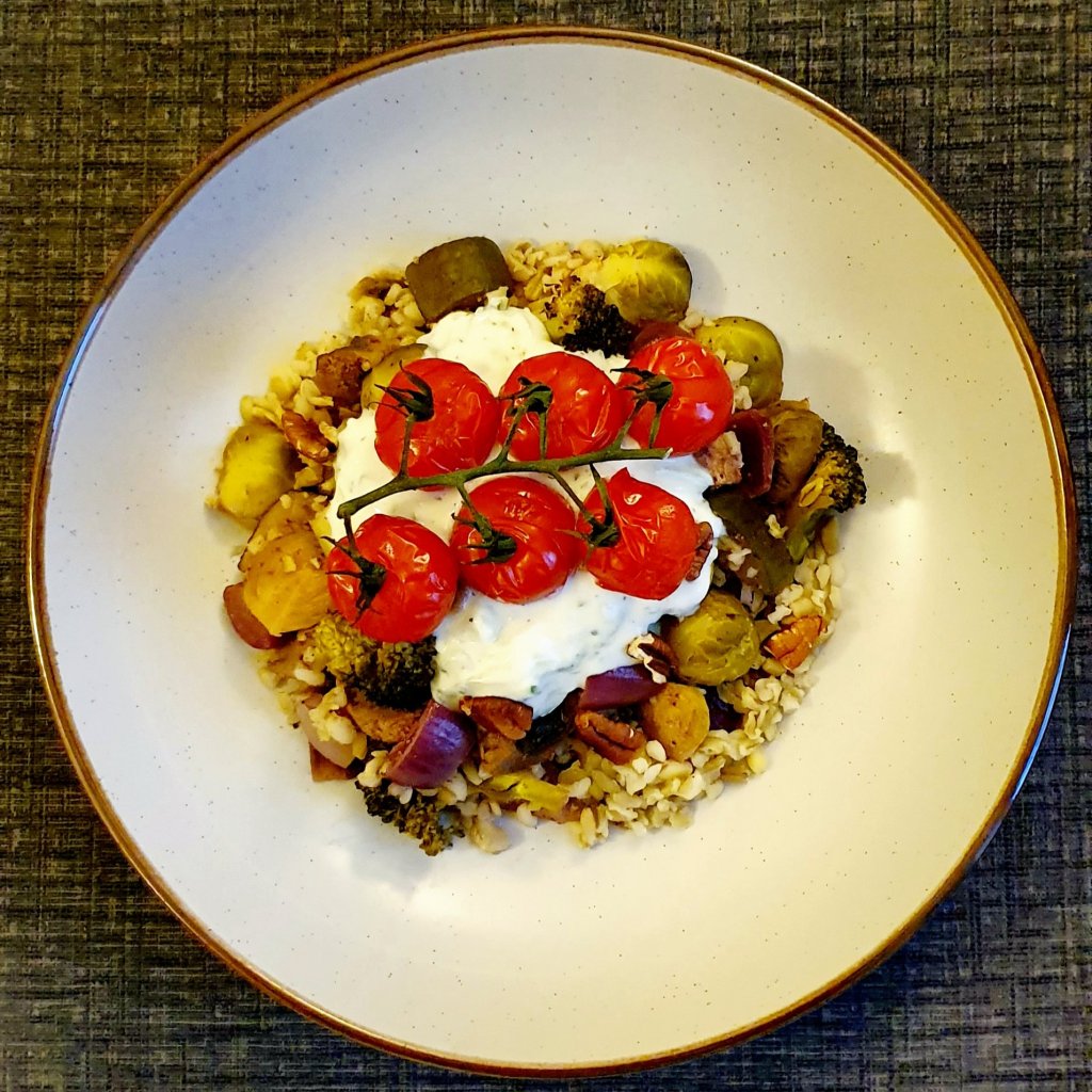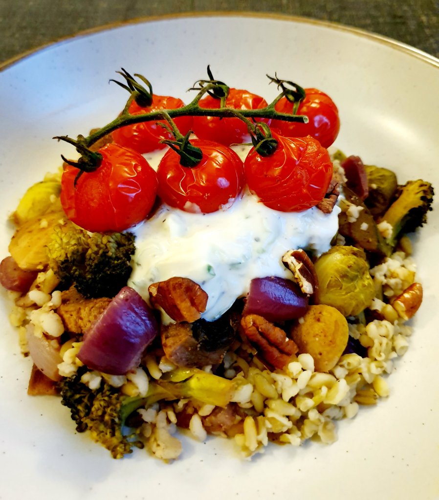 Mix the vegetables with the freekeh then add it onto serving dishes and top each portion with a generous dollop of Tzatziki. Add the juicy tomatoes Sprinkle with toasted pecans.