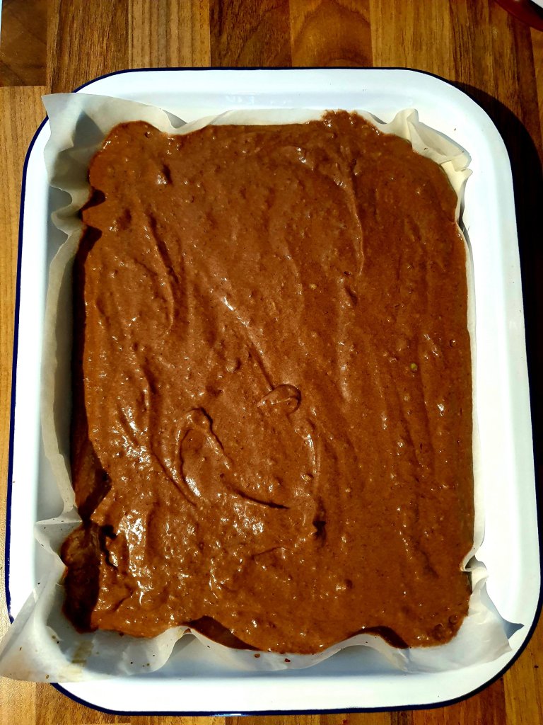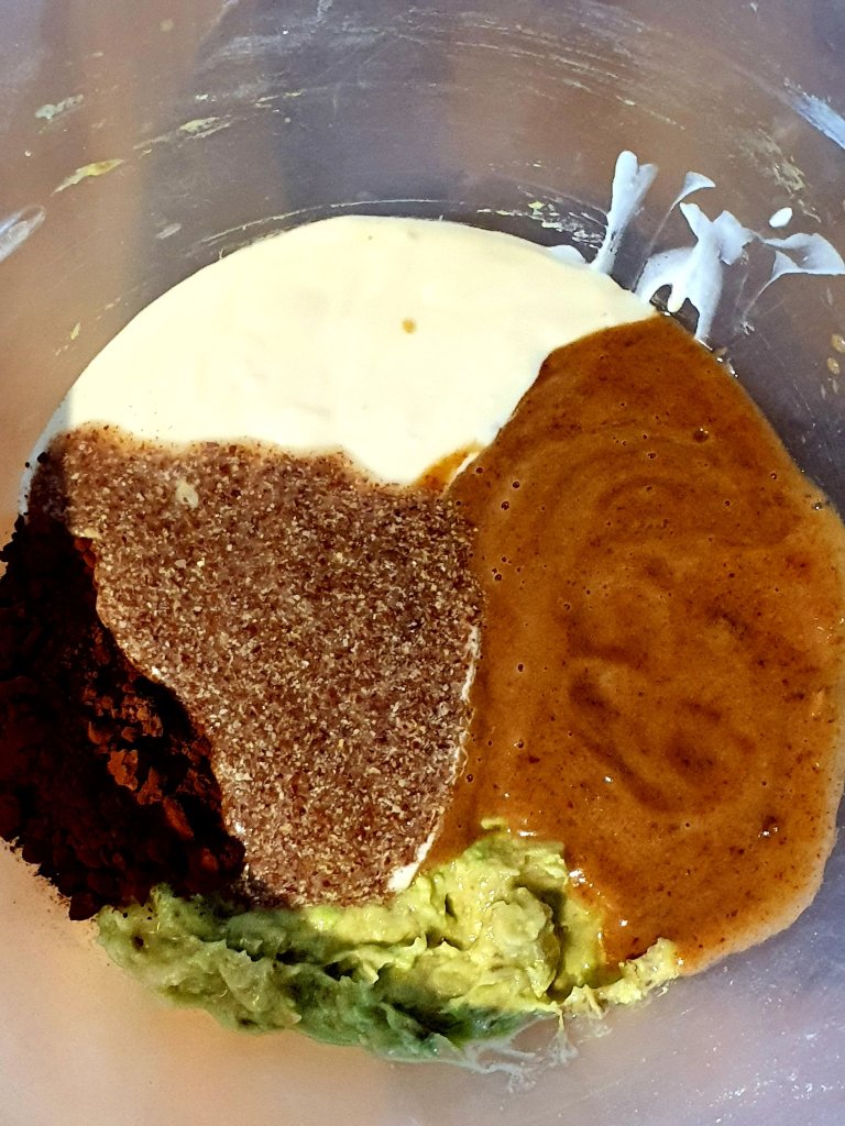 In a bowl add the mashed banana, mashed avocado, yogurt, blended dates, cocoa powder and mix it well. Then add the flour and baking power and mix it until combined. Transfer it to a baking tray lined with baking parchment paper and put in the oven for about 30 minutes. Let it cool before cutting it.