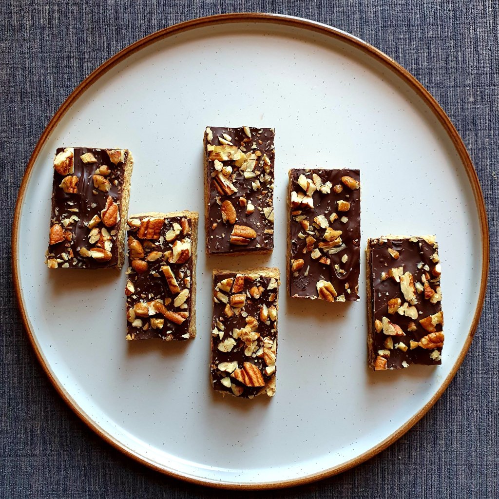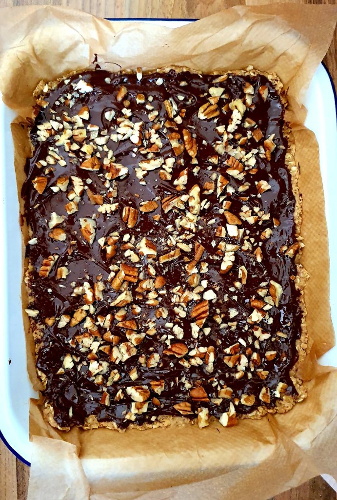 Transfer it to a baking tray lined with parchment paper. Make sure you spread it evenly. Melt the dark chocolate for 60 seconds on the microwave and add over the dough. Sprinkle with chopped pecans!