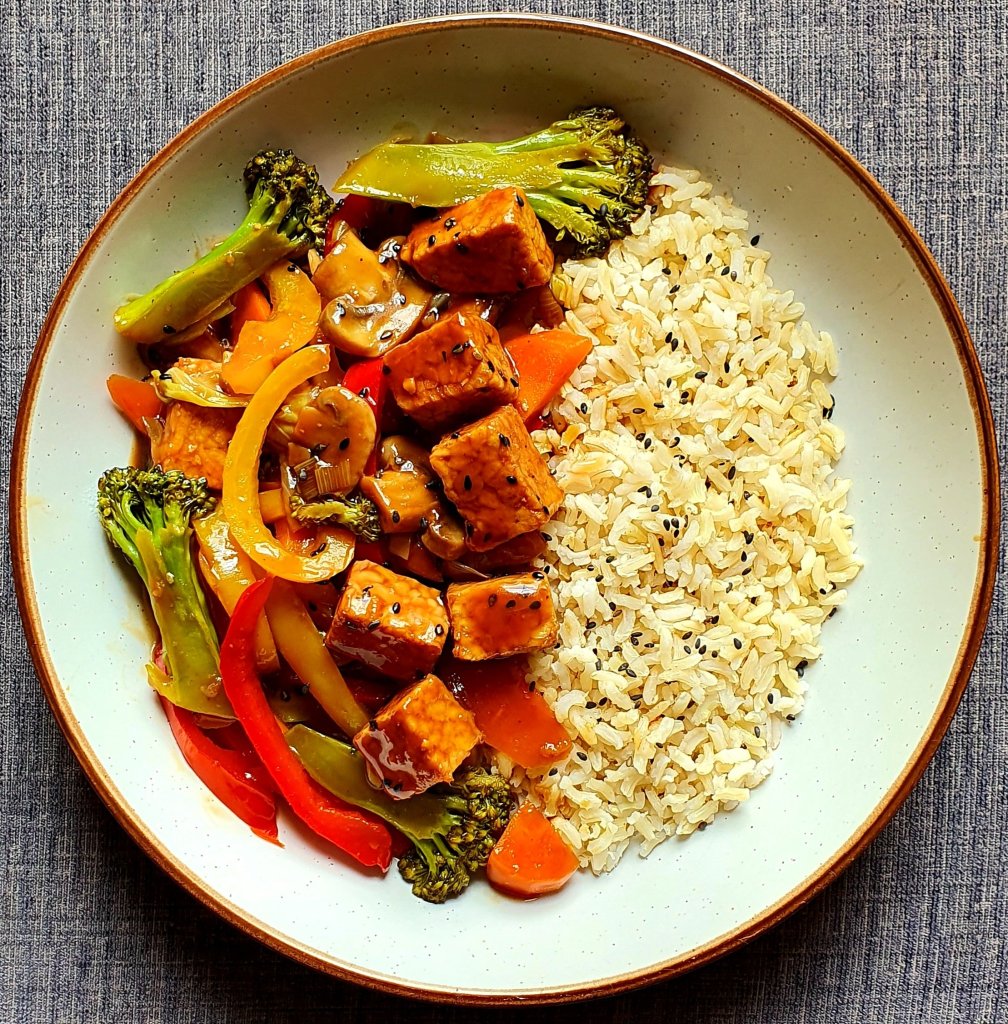 Quick oil free stir fry for lunch full of flavour, colour and texture, served with brown rice! 🥰💙🍀