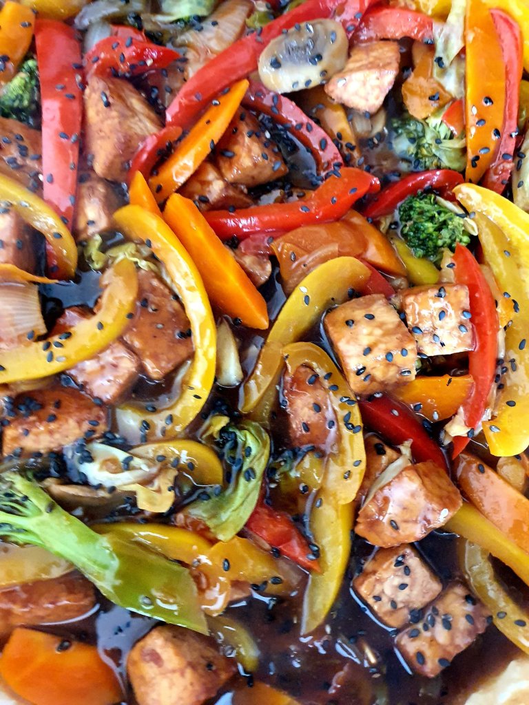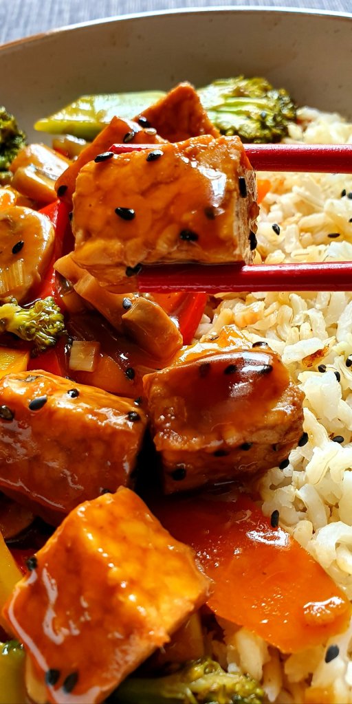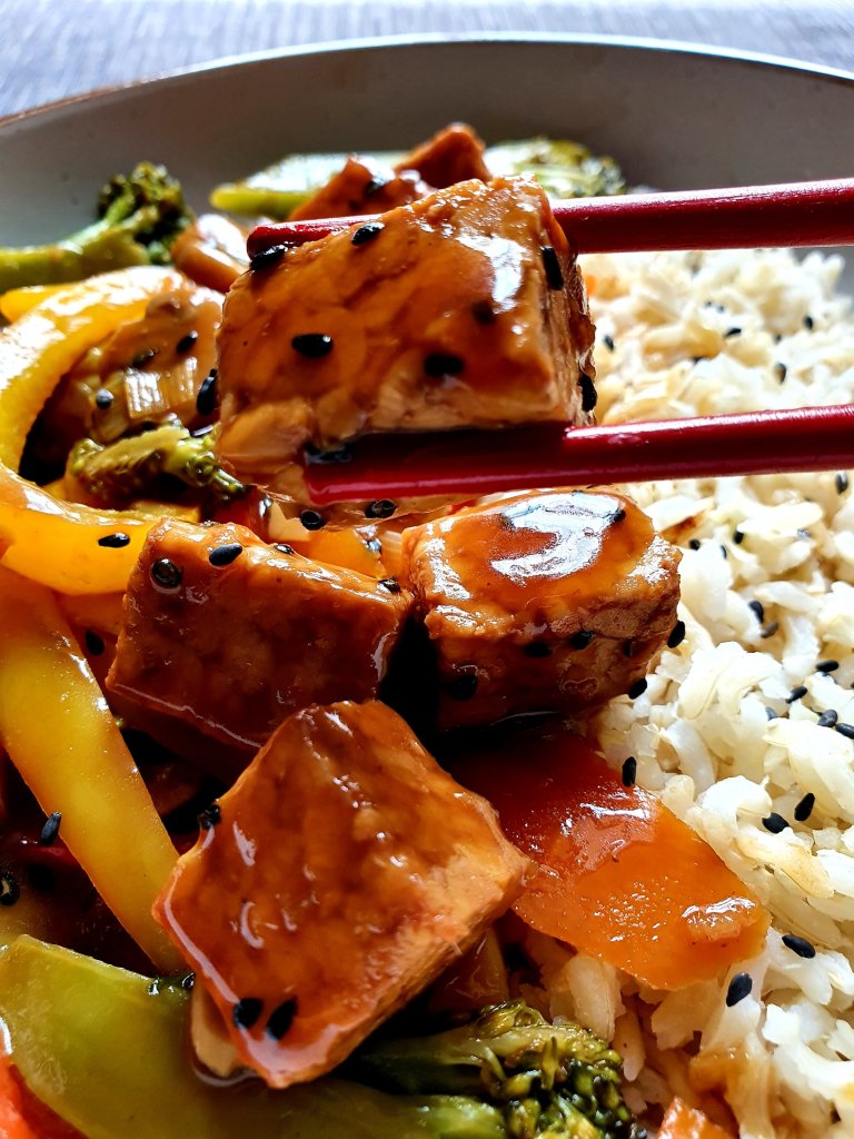 In to the same pan, add all the ingredients with the tempeh marinade and 50ml of water. Cover the pan for 10 minutes. After that, add the tempeh to the pan and let it cook for further 5 minutes. Check if the carrots and broccoli are al dente and it is are ready to serve.