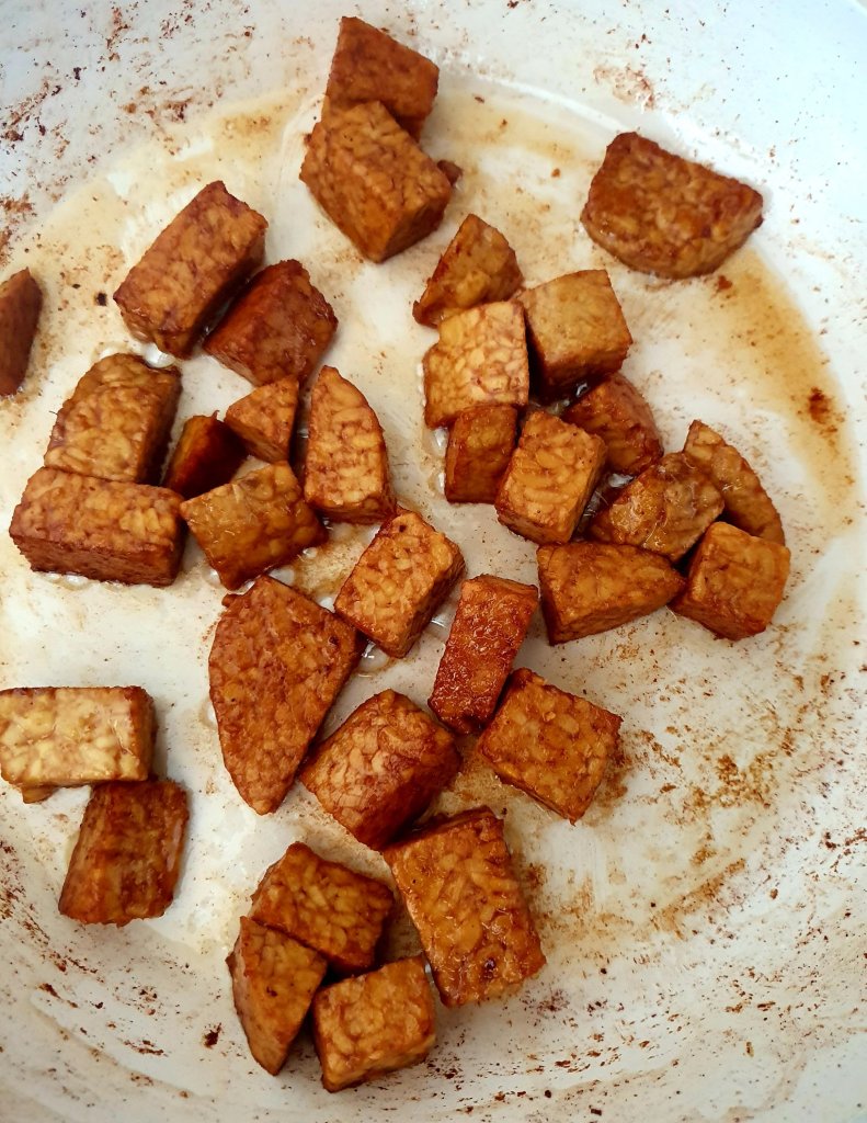 200g of tempeh marinated (2 Tbsp of tamari, juice of half a lime, 1 Tbsp of dates syrup. marinate the tempeh for 30 minutes before cooking)