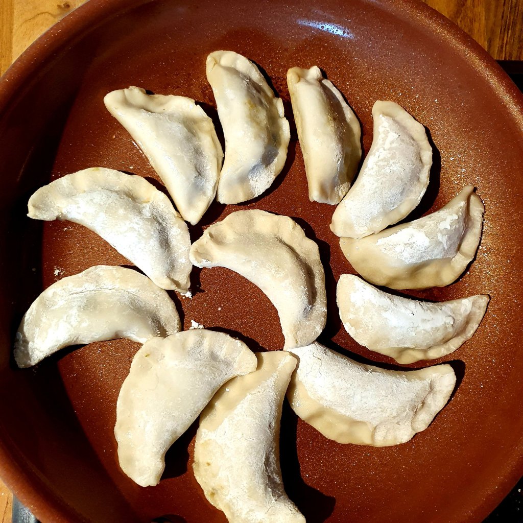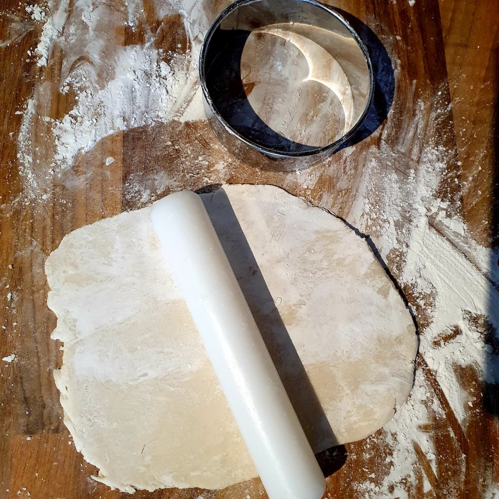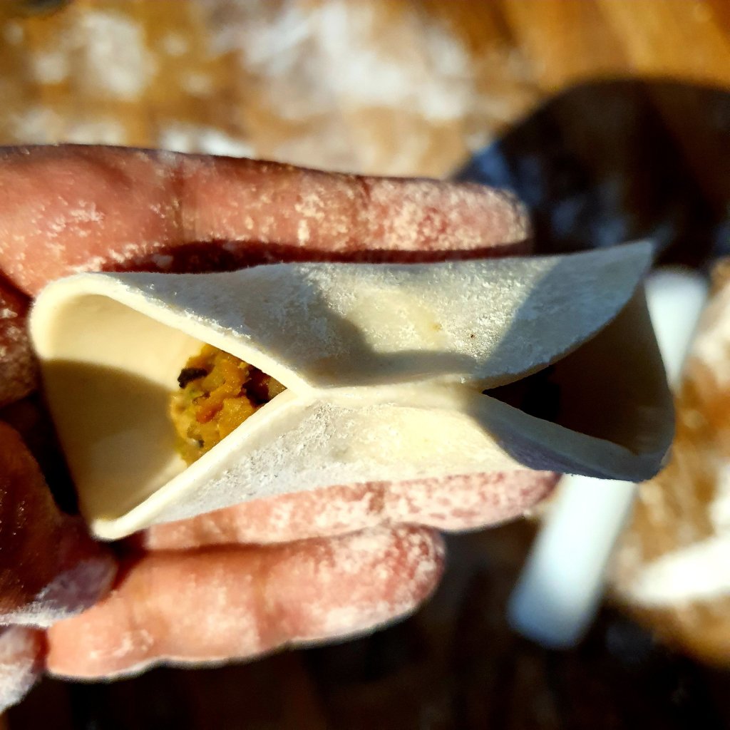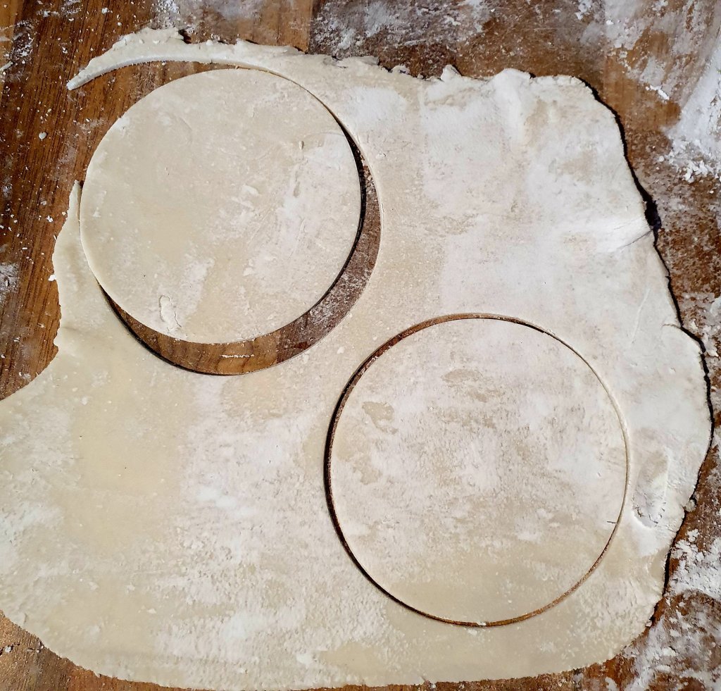 Divide the dough in 4 parts. While working on one, make sure you cover the rest with a clean tea towel. Do not stretch the dough too much. I managed to cut 6 wrappers each time and making the dumplings soon after that, before moving to another dough.