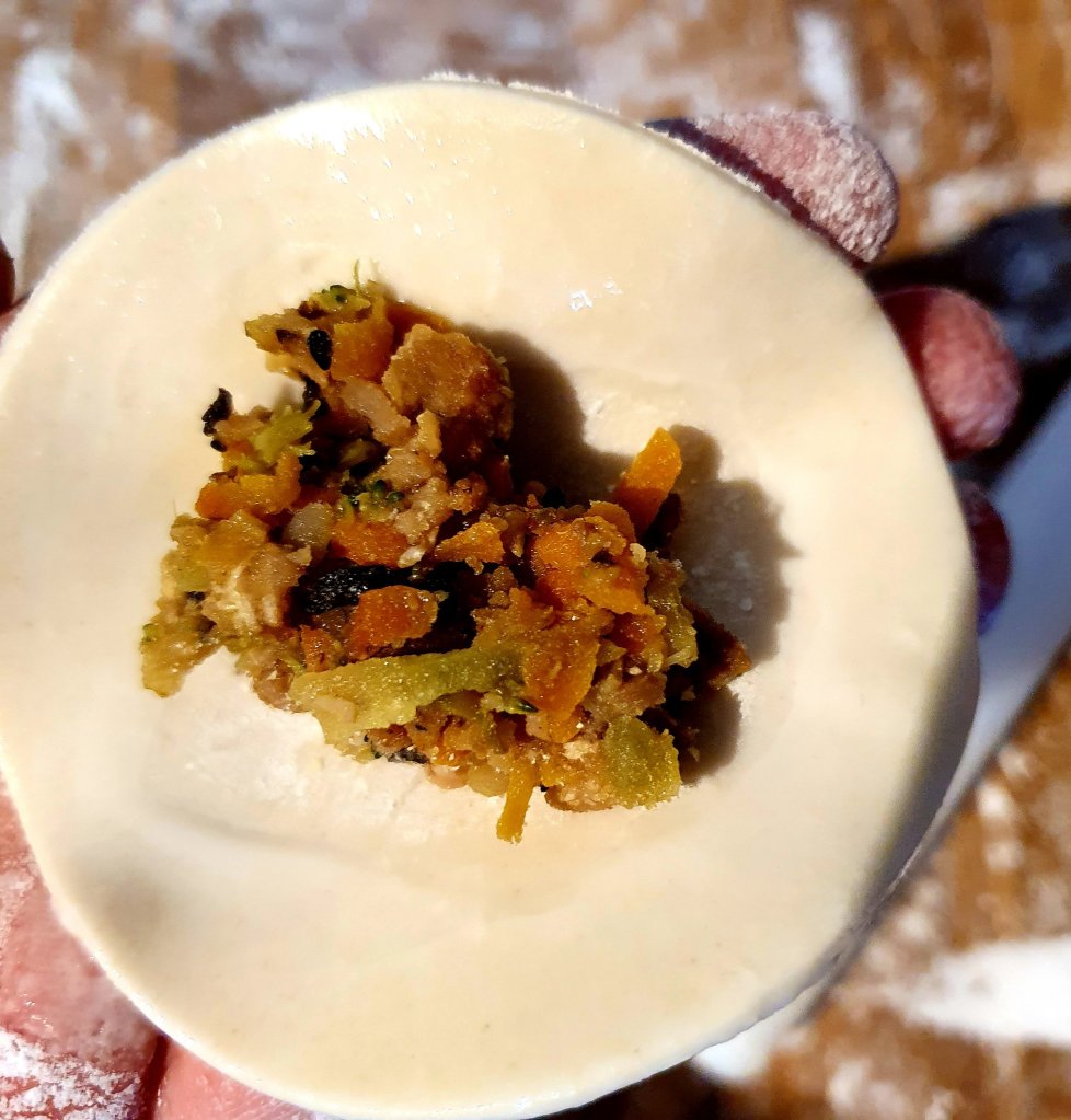Once you have all the dumplings ready, place them on a non-stick pan and add 12 cup of hot water. Place a lid and let it steam until the water evaporates. Alternatively you can use a steamer.