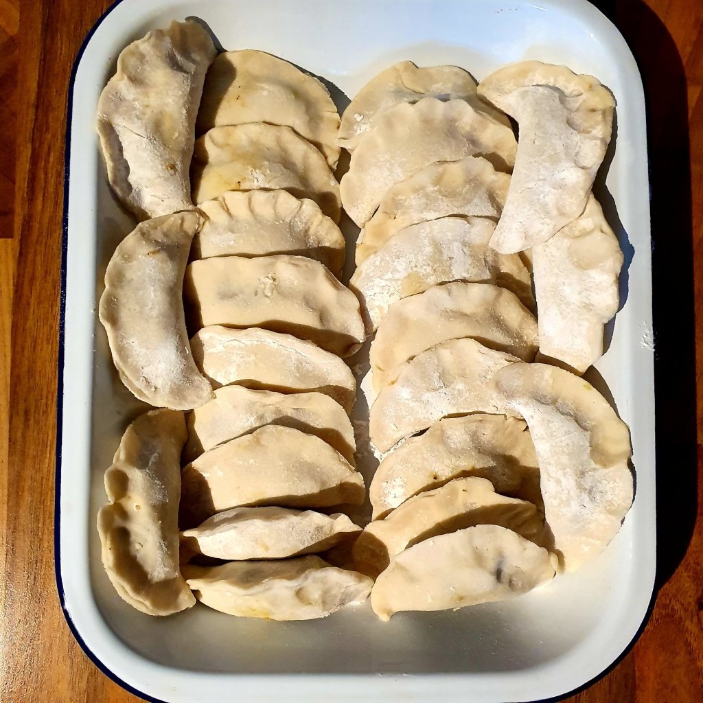 Use cold water to seal the wraps. Remember to cover the ready made dumplings unter another tea towel so it won’t dry out!